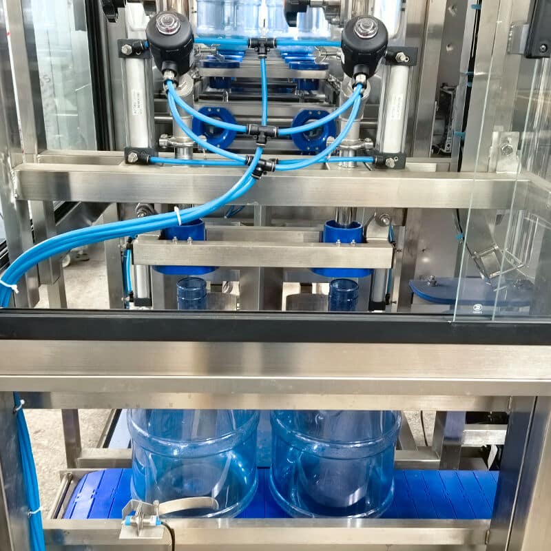 The filling unit uses high-precision valves and AIRTAC pneumatic components for stable, drip-free operation. Controlled by SIEMENS PLC, it ensures accurate water levels and smooth barrel positioning for 10L–20L containers.