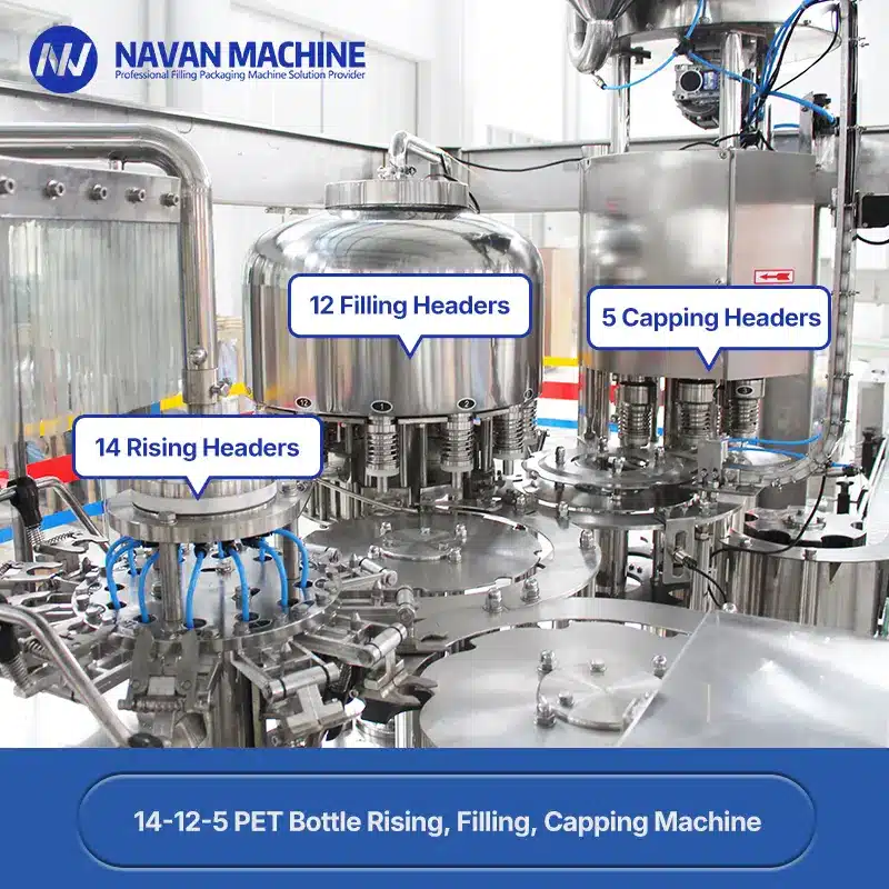 The final stage of the filling machine involves 5 constant-torque capping heads. This system guarantees a leak-proof seal for every plastic screw cap, maintaining the freshness of the bottled water.